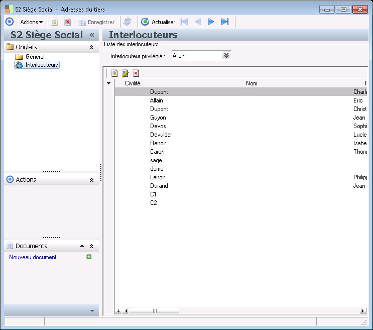 Interlocuteurs : pour ajouter un interlocuteur, utilisez la commande Créer interlocuteur du menu contextuel de ce volet ou du menu Actions ou encore cliquez sur le bouton Créer au-dessus de la grille.
