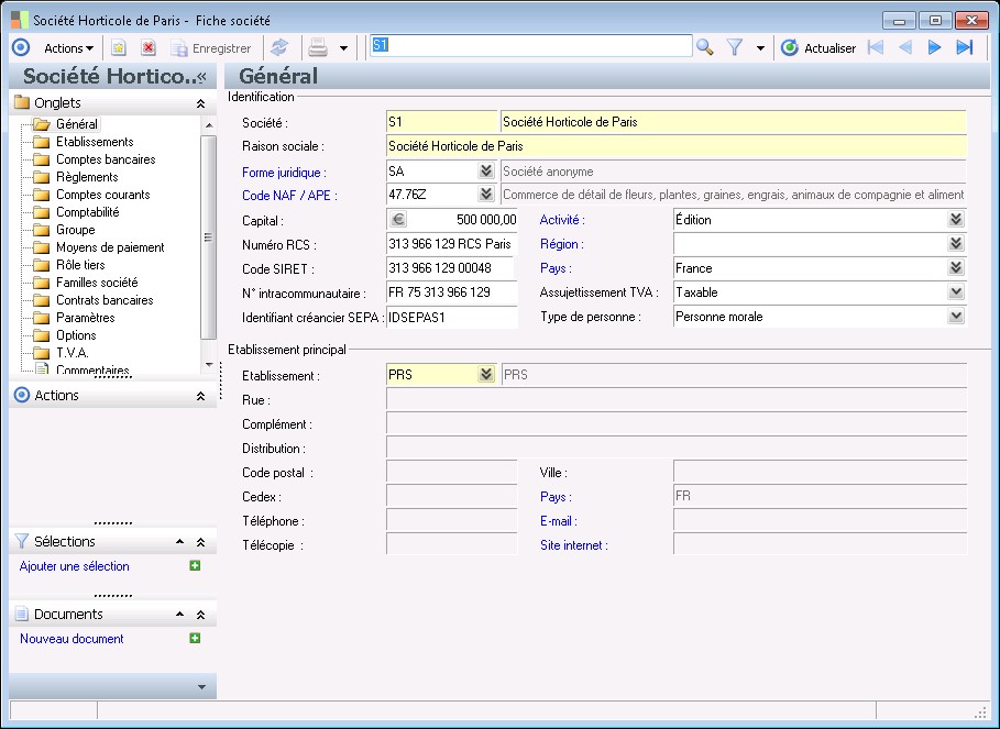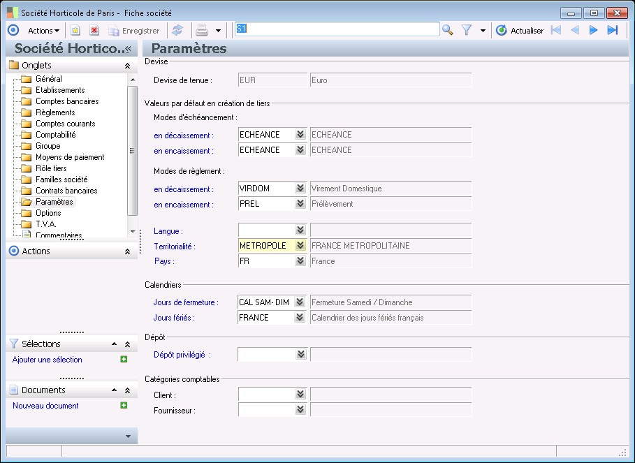 Cette zone permet de renseigner le pays d'après les informations contenues dans la table des pays. Le pays proposé par défaut correspond à celui de l'établissement indiqué dans la fiche société.