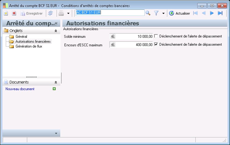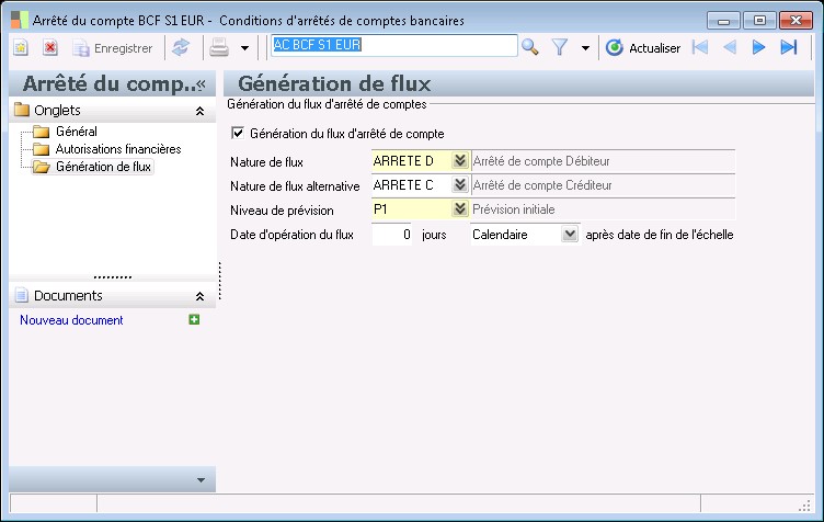 Permet d'indiquer le compte sur lequel le flux d'agios va être débité. Ce compte est obligatoire, même lorsqu'on ne génère pas de flux d'arrêté, parce qu'il permet de déterminer la condition de jours d'arrêtés applicable lorsque l'arrêté porte sur un périmètre de plusieurs comptes.
