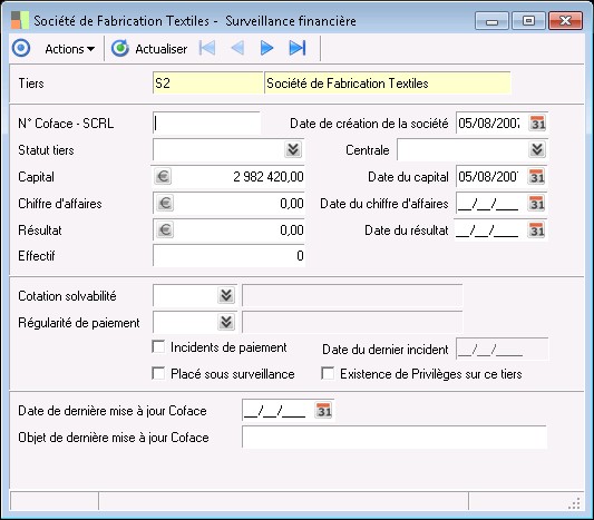 Cette zone peut notamment être mis à jour automatiquement lors des connexions au Serveur Coface via le Portail Sage pour la surveillance financière du tiers.