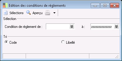 Cette fonction permet d'éditer la liste des conditions de règlements en fonction de certains critères de sélection. Elle est lancée par la fonction Impression de la liste et de la fiche des conditions de règlements, elles-mêmes accessibles au niveau du menu Paramètres / Règlements / Conditions de règlement.