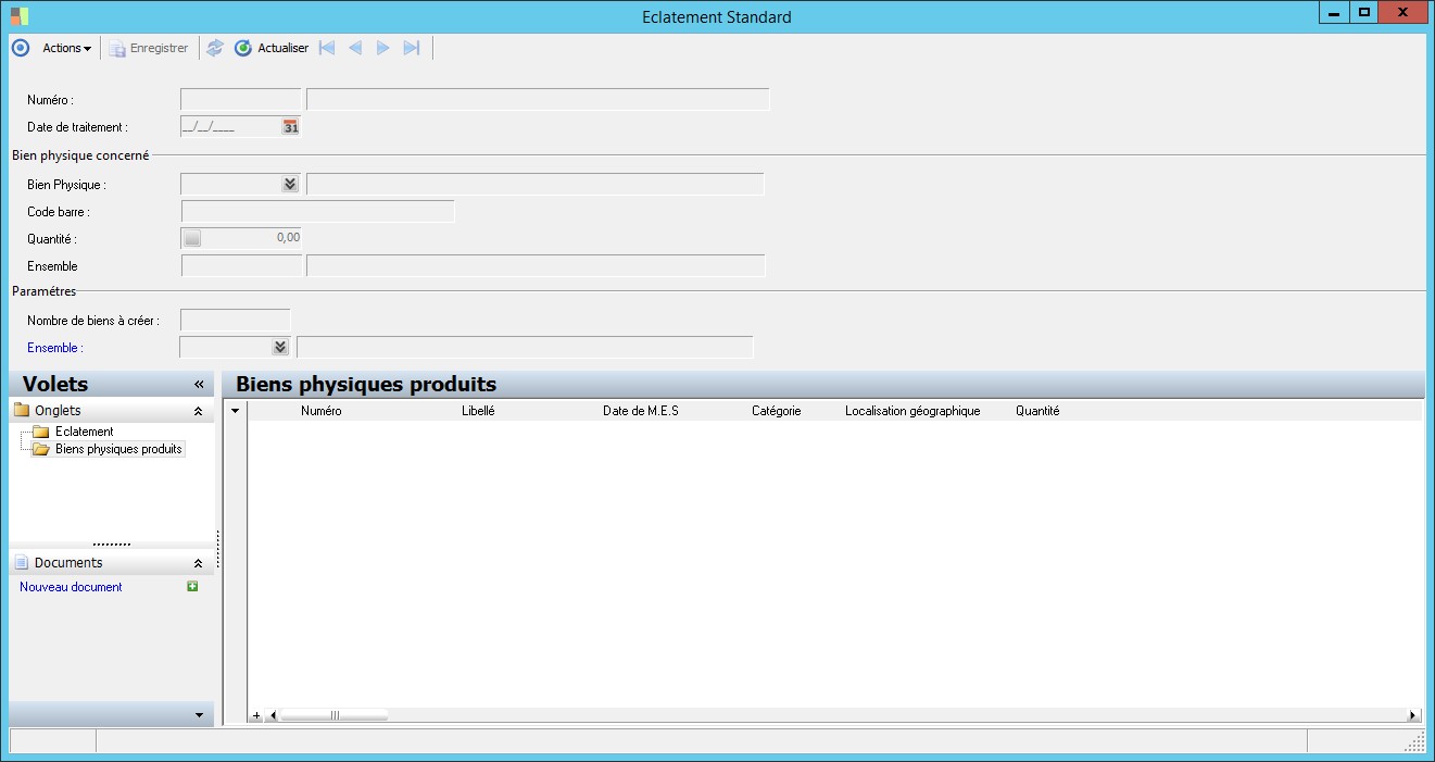(Sage FRP 1000 Suite Financière) Menu Immobilisations > Suivi physique > Eclatement > Eclatement Standard