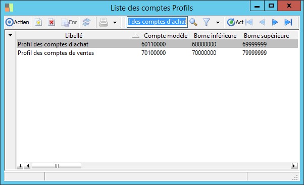 (Sage FRP 1000 Suite Financière) Menu Comptabilité > Paramètres > Comptabilité générale > Liste des comptes Profils