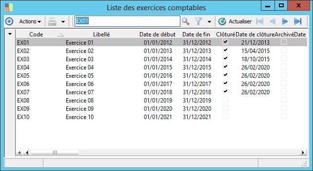 Le code identifie l'exercice de façon unique.Les exercices utilisent les périodes de la dimension temps préalablement créée.On peut avoir autant d'exercices que nécessaire, dans la limite de la dimension temps. |