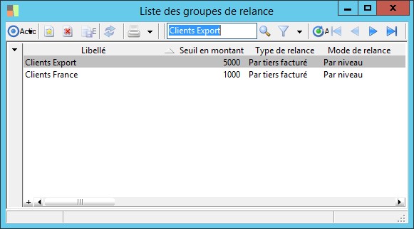 (Sage FRP 1000 Suite Financière) Menu Comptabilité Groupe > Paramètres > Tiers > Liste des groupes de relance