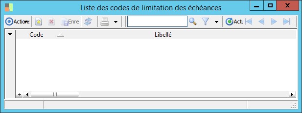 (Sage FRP 1000 Suite Financière) Menu Comptabilité > Paramètres > Règlements > Liste des codes de limitation des échéances