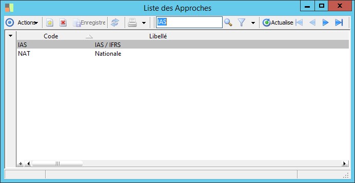 Cette fenêtre affiche la liste des approches comptables.Elle est ouverte à partir de la fonction Paramètres généraux / Généraux / Approches . Elle permet de les créer, de les consulter, de les modifier et de les supprimer si nécessaire.