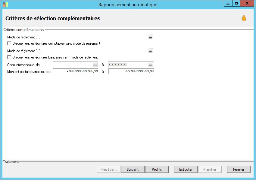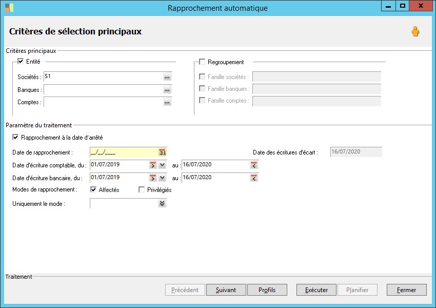 Cette option permet de sélectionner les critères par entité :- Sociétés.- Banques.- Comptes. |