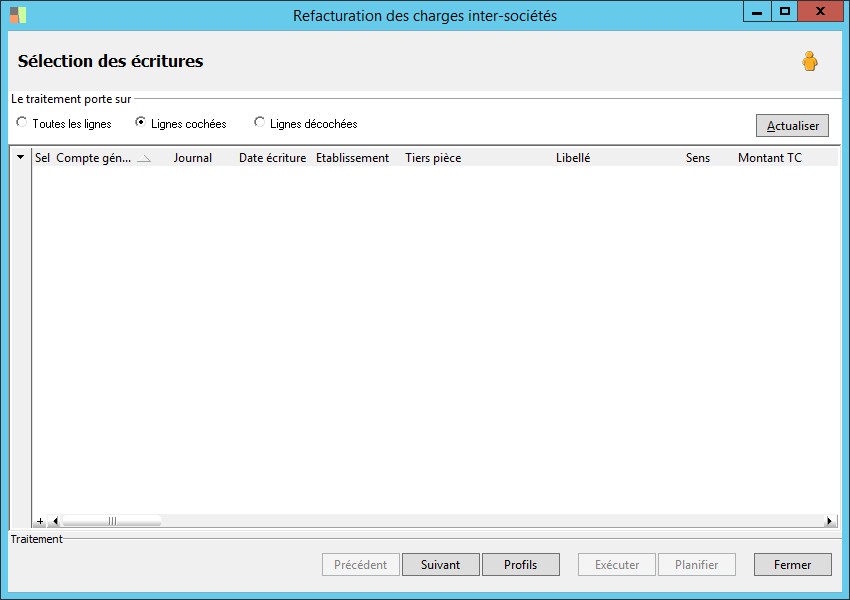 Une écriture ayant été refacturée ne peut pas être refacturée à nouveau. Si le lotde refacturation est supprimé, l'écriture d'origine est à nouveau proposée à la refacturation. |