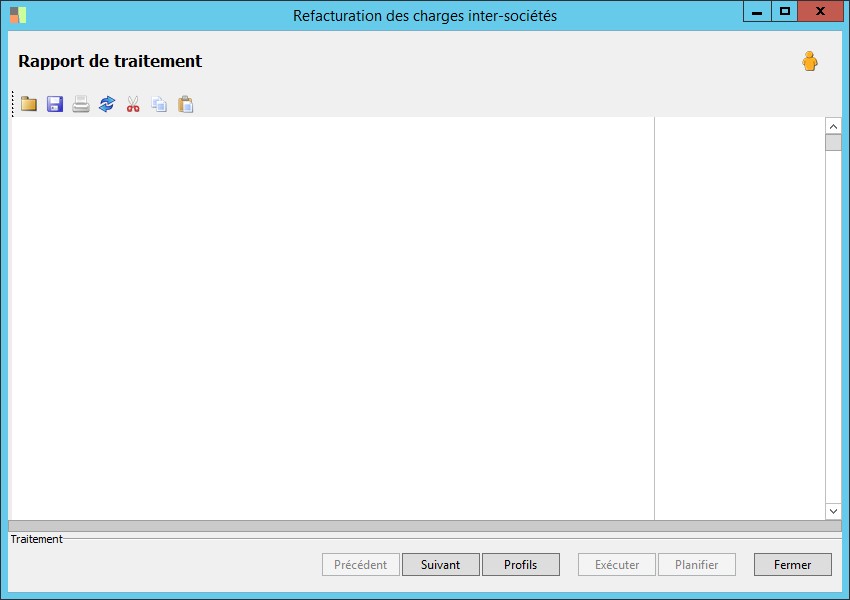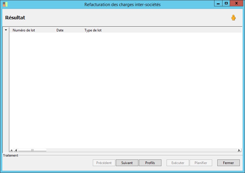 Uniquement les écritures enregistrées sur un compte refacturable et dont la norme est égale à « Exploitation » sont proposées. L'écran « Rapport » de traitement permet d'exécuter le traitement. L'écran « Résultat » affiche le lot créé. Vous pouvez consulter le détail du lot en double-cliquant sur la ligne. Le traitement génère une pièce par société refacturée et par établissement en appliquant la règle de refacturation inter-sociétés. Les pièces de refacturation sont créées dans la devise de tenue de compte et ont pour norme « Exploitation ». |