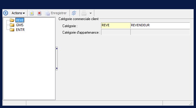 Cet écran contient la liste des catégories et sous-catégories commerciales client, elles servent à regrouper les clients ayant des caractéristiques communes et sont utilisées en fiche client et en paramétrage des affectations des commerciaux.Nota : La définition arborescente des catégories commerciales permet de traiter les cas généraux et les exceptions en évitant un paramétrage in-extenso : seules les catégories commerciales spécifiques peuvent éventuellement être définies comme sous-catégorie d'une catégorie commerciale père. Les clients répondant au cas général peuvent être affectés sur la catégorie commerciale père. Il est ainsi possible de définir des catégories générales et d'affiner au fur et à mesure des besoins selon la précision souhaitée. |