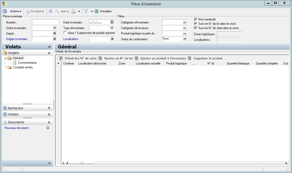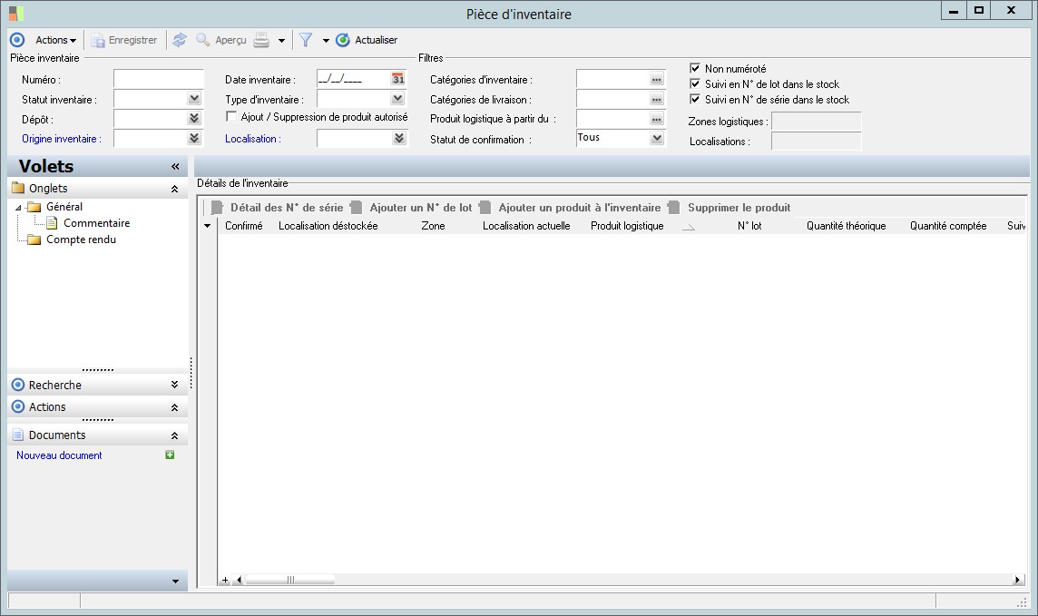 (Sage FRP 1000 Suite Financière) Menu Processus Opérationnels > Stocks > Inventaire > Pièce d'inventaire