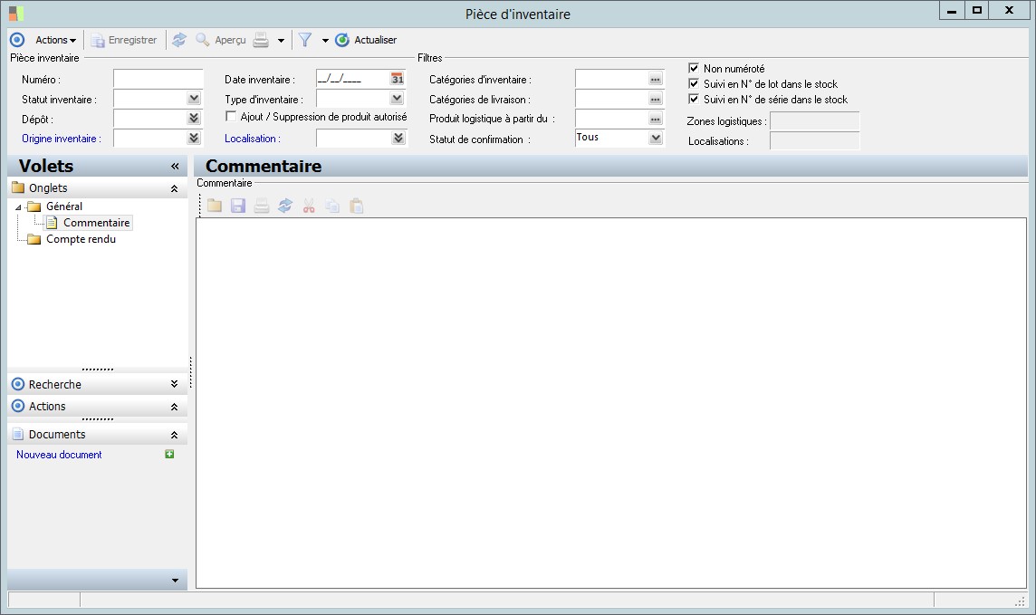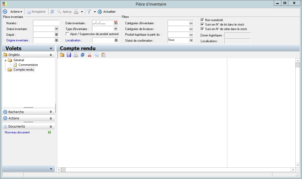 Cette zone indique le stade de réalisation de l'inventaire :- Préparation : l'inventaire a fait l'objet de la préparation d'inventaire (création de la pièce d'inventaire). - Saisie : l'inventaire est en cours de saisie.- Validé : la pièce d'inventaire a mis à jourle stockLorsqu'il existe un inventaire en cours de saisie sur un produit donné et un dépôt donné, il n'est pas possible de créer un inventaire sur le même produit et le même dépôt. L'inventaire doit êter validé pour qu'un inventaire sur le même produit/dépôt soit autorisé. |