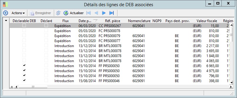 (Sage FRP 1000 Suite Financière) Menu Processus Opérationnels > Achats > Déclaration d'échanges de biens > Détails des lignes de DEB associées