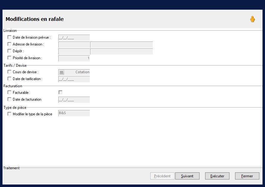 Cette fonction permet de modifier en rafale un certain nombre d'informations des lignes de commande déjà saisies.