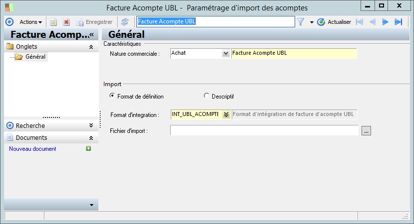 (Sage FRP 1000 Suite Financière) Menu Processus Opérationnels > Initialisation > Import de pièces commerciales > Paramétrage d'import des acomptes