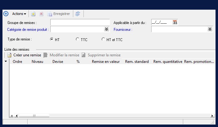 La saisie des remises s'effectue dans cette fenêtre en cliquant sur les boutons disposés au dessus de la grille ou en sélectionnant les commandes disponibles dans le menu