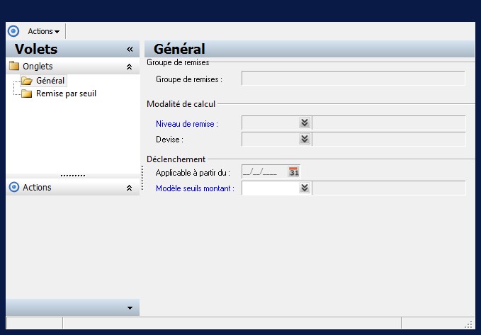 Il permet d'enregistrer le montant des remises en pourcentage ou en valeur en fonction des différents seuils paramétrés. Cet enregistrement s'effectue dans deux grilles. On peut combiner remises en pourcentage et remises en valeur pour des niveaux différents.