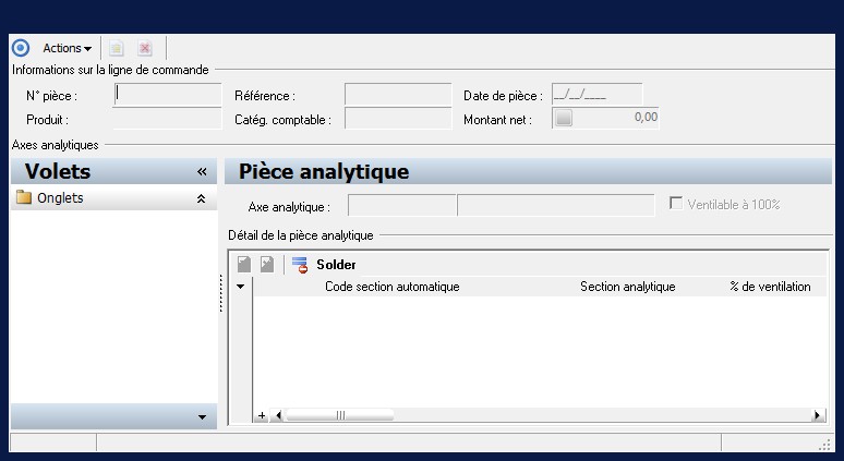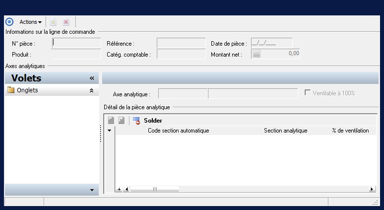 Cette zone représente le pourcentage de ventilation du montant HT net de la commande sur la section analytique considérée.Les factures liées à la commande seront comptabilisées selon la ventilation qui sera associée à celle-ci. |