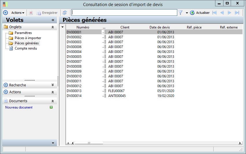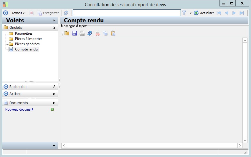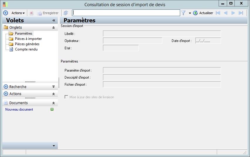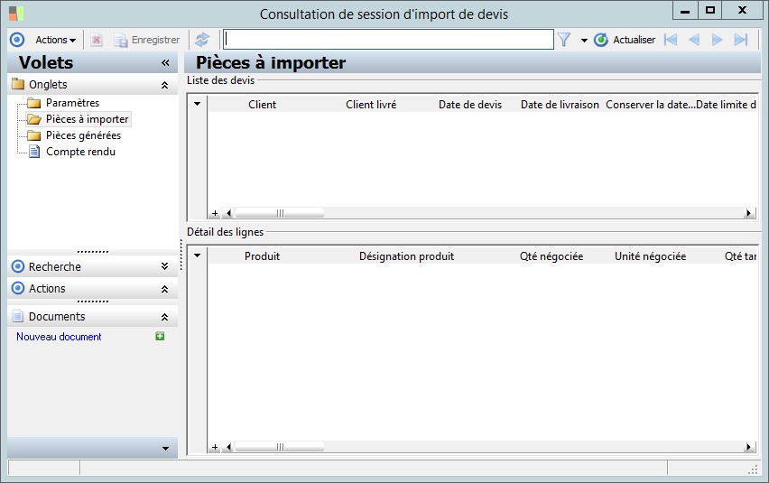 (Sage FRP 1000 Suite Financière) Menu Processus Opérationnels > Initialisation > Import de pièces commerciales > Consultation de session d'import de devis