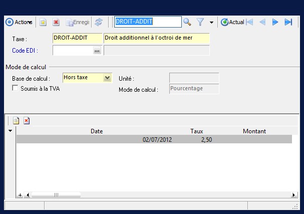 Permet d'indiquer si la taxe est calculé forfaitairement (montant) ou en fonction d'un %.Pour le poids, le volume et la quantité, la taxe est calculée sur un MontantPour le HT la taxe est calculée en pourcentage |