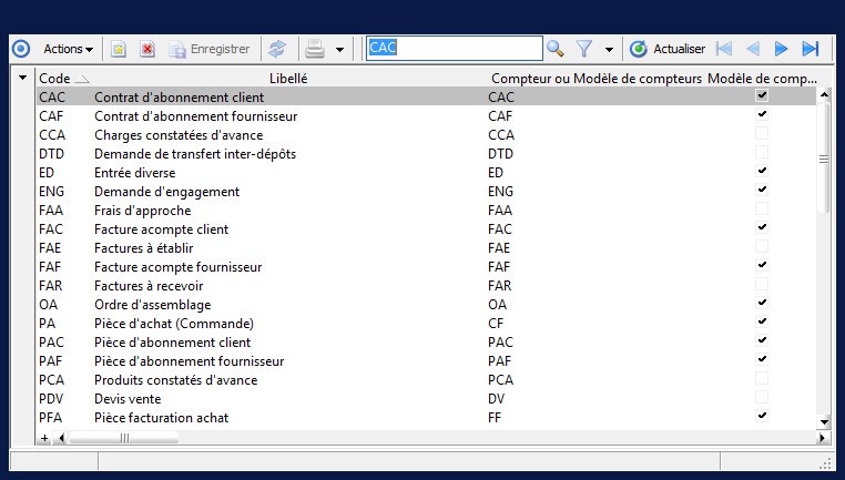 (Sage FRP 1000 Suite Financière) Menu Processus Opérationnels > Paramètres > Pièces commerciales > Liste des types de pièce