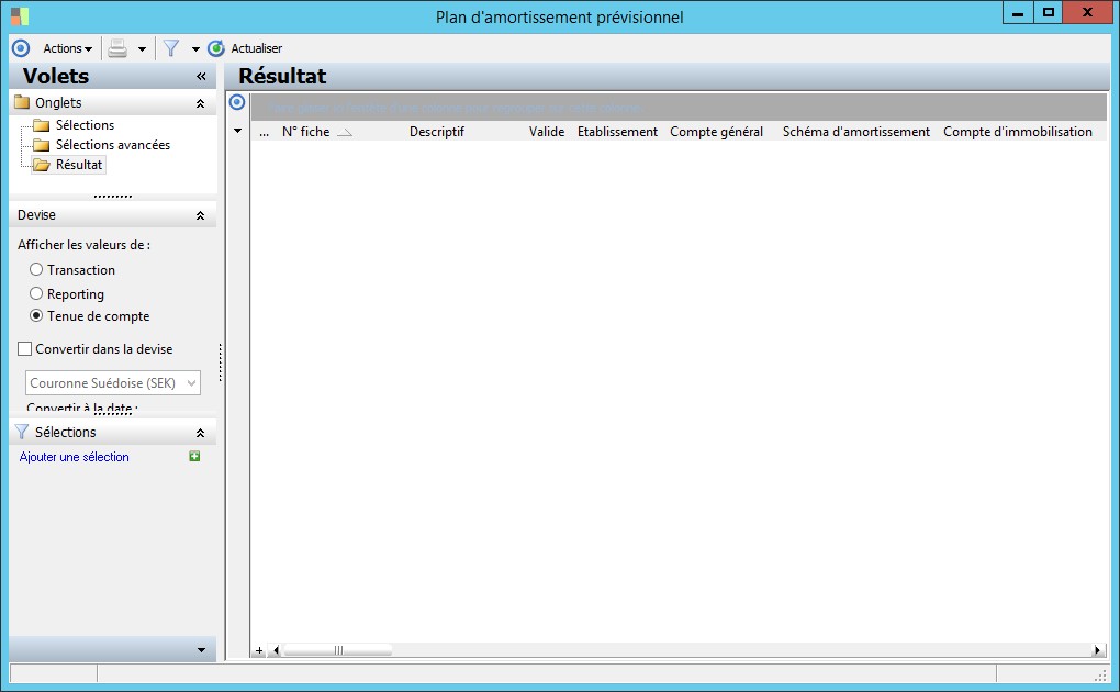 (Sage FRP 1000 Suite Financière) Menu Immobilisations > Restitutions > Plans d'amortissement > Plan d'amortissement prévisionnel