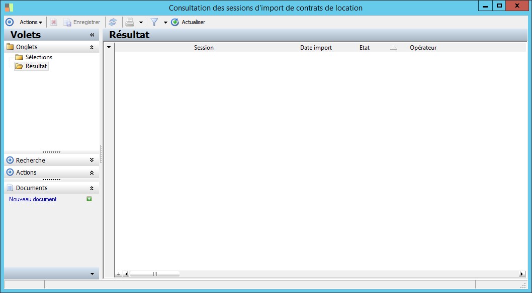 (Sage FRP 1000 Suite Financière) Menu Immobilisations > Initialisation > Import des contrats > Consultation des sessions d'import de contrats de location