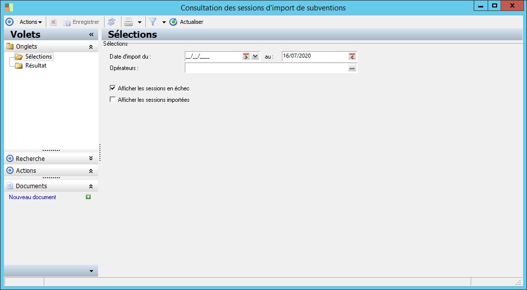 (Sage FRP 1000 Suite Financière) Menu Immobilisations > Initialisation > Import des subventions > Consultation des sessions d'import de subventions