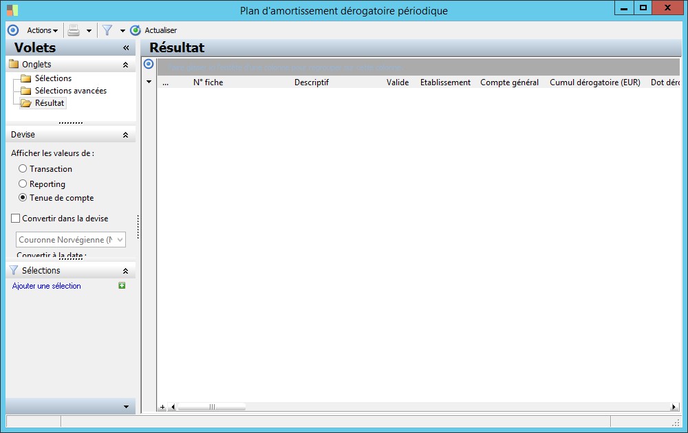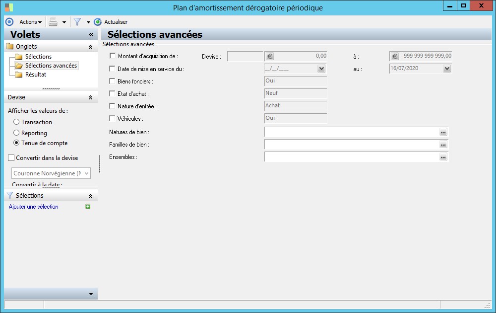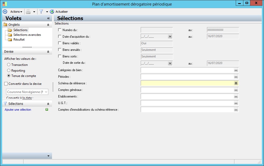 (Sage FRP 1000 Suite Financière) Menu Immobilisations > Restitutions > Plans d'amortissement > Plan d'amortissement dérogatoire périodique