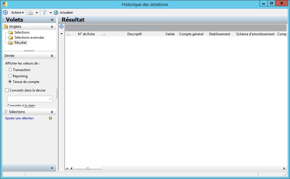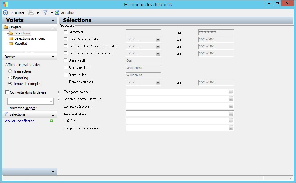 (Sage FRP 1000 Suite Financière) Menu Immobilisations > Restitutions > Plans d'amortissement > Historique des dotations