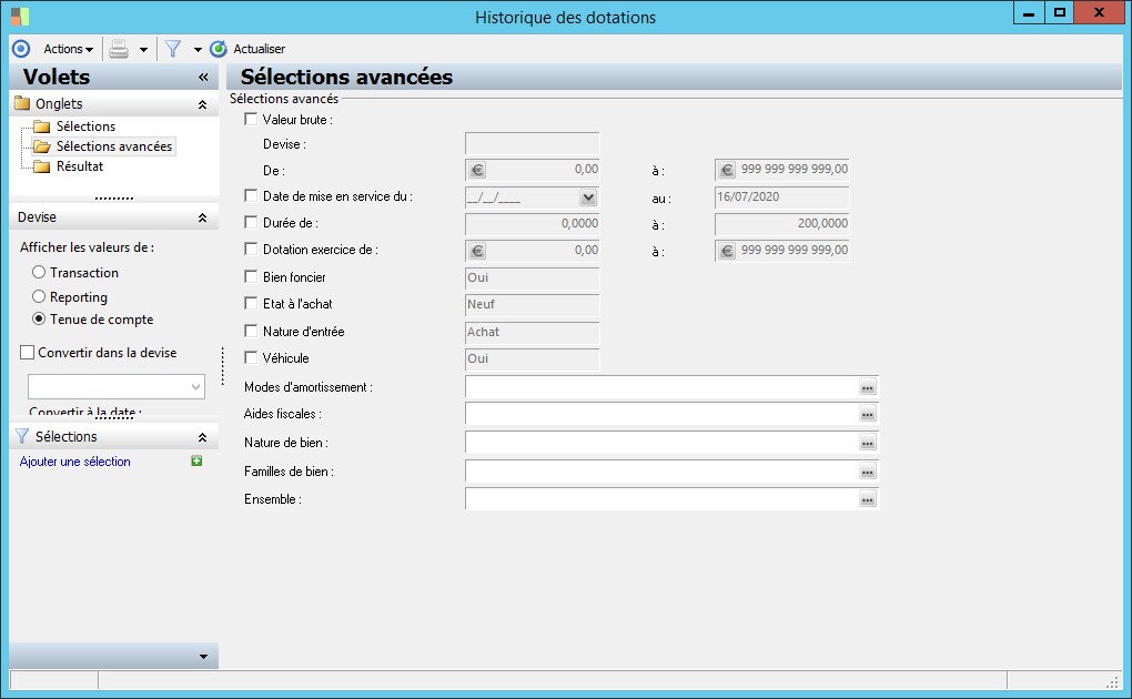 Ce paramètre permet de faire une sélection sur la dotation de l'exercice en cours (si la case est cochée). |