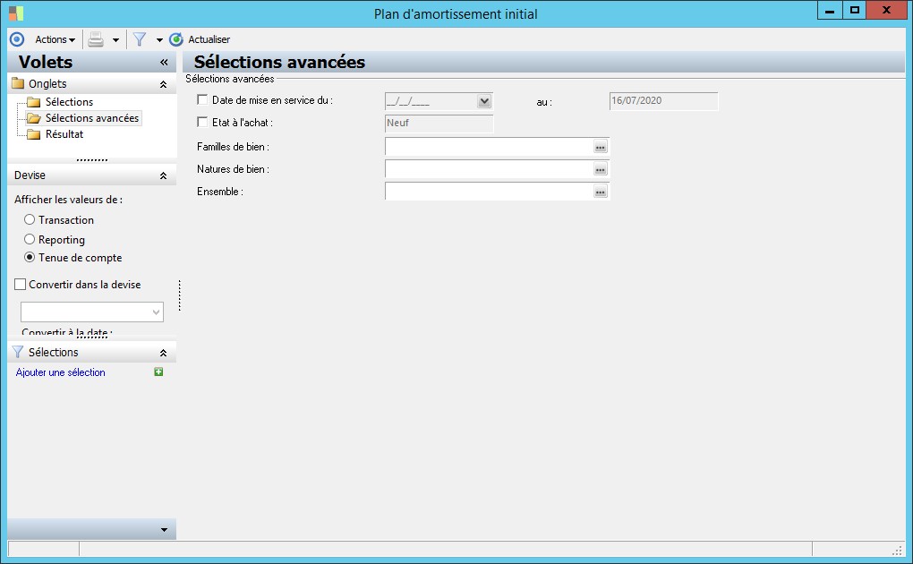 (Sage FRP 1000 Suite Financière) Menu Immobilisations > Restitutions > Plans d'amortissement > Plan d'amortissement initial