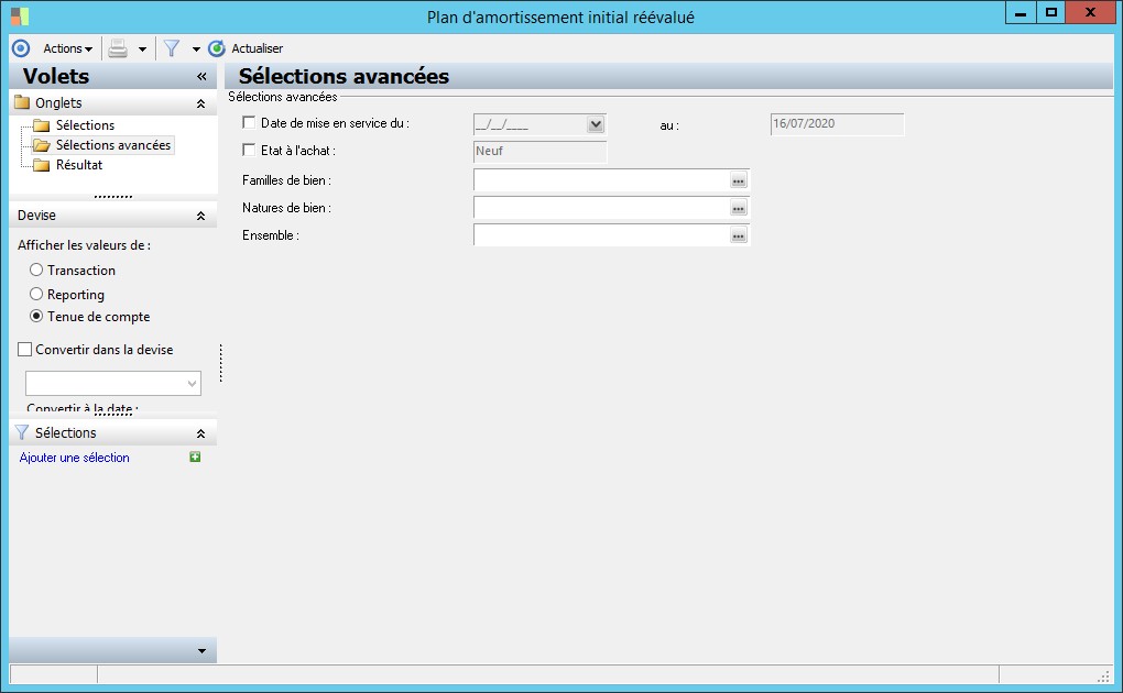 (Sage FRP 1000 Suite Financière) Menu Immobilisations > Restitutions > Plans d'amortissement > Plan d'amortissement initial réévalué
