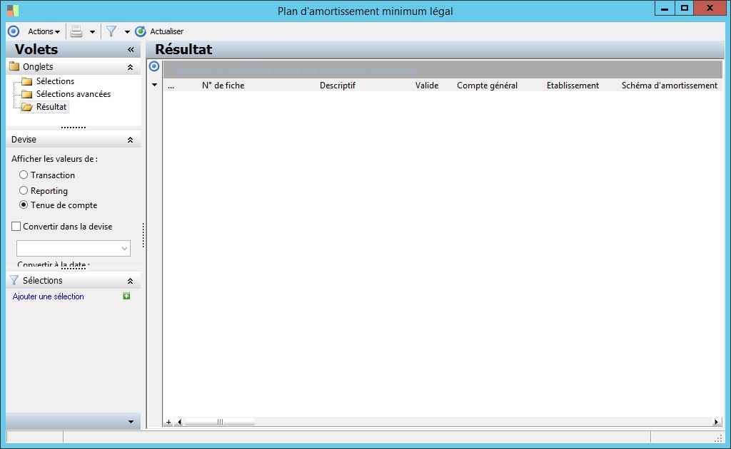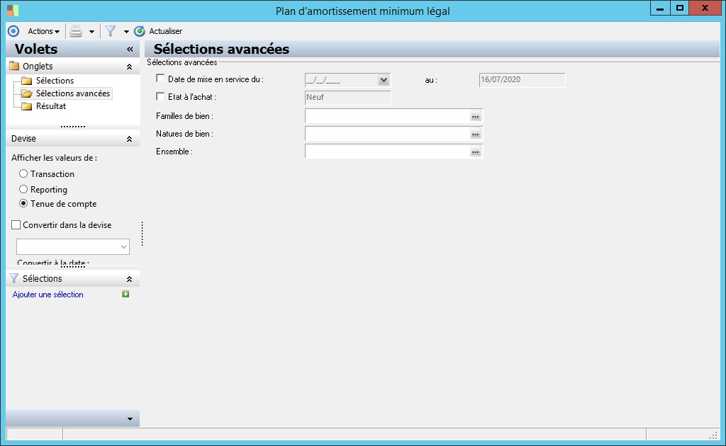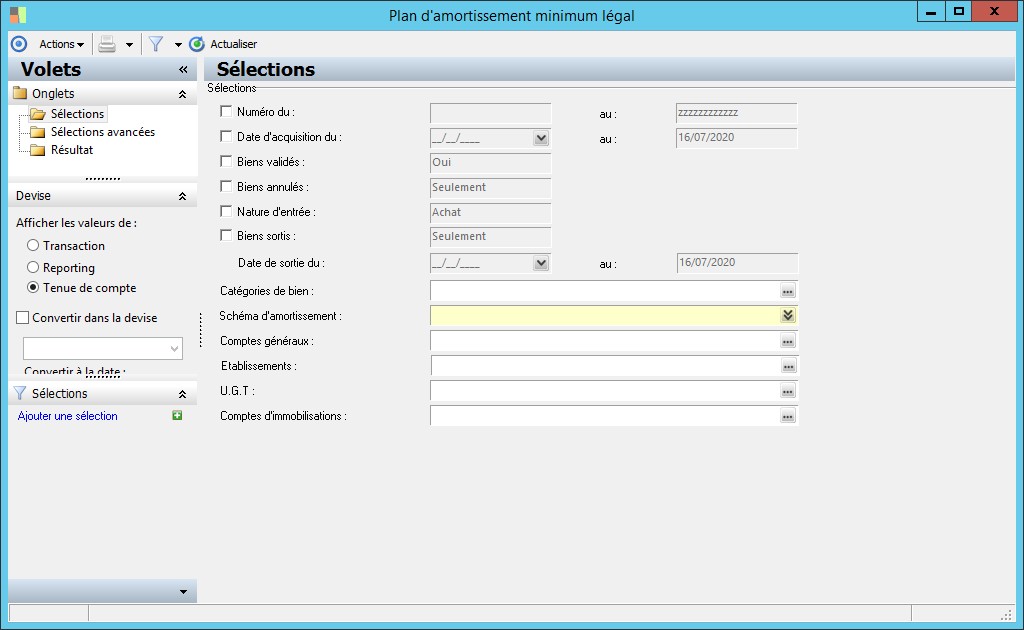 (Sage FRP 1000 Suite Financière) Menu Immobilisations > Restitutions > Plans d'amortissement > Plan d'amortissement minimum légal