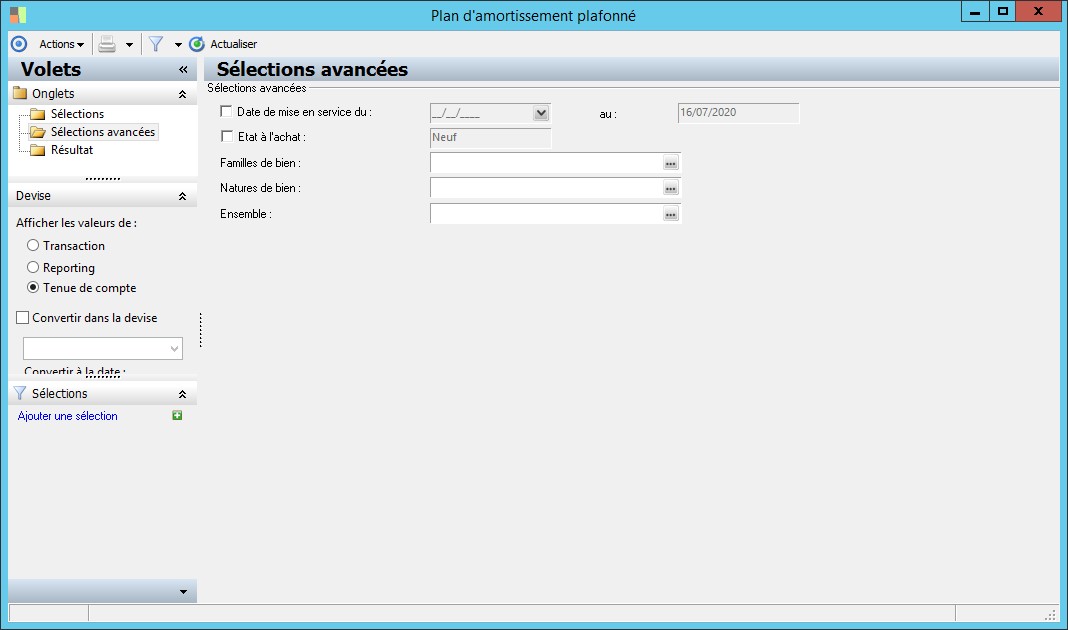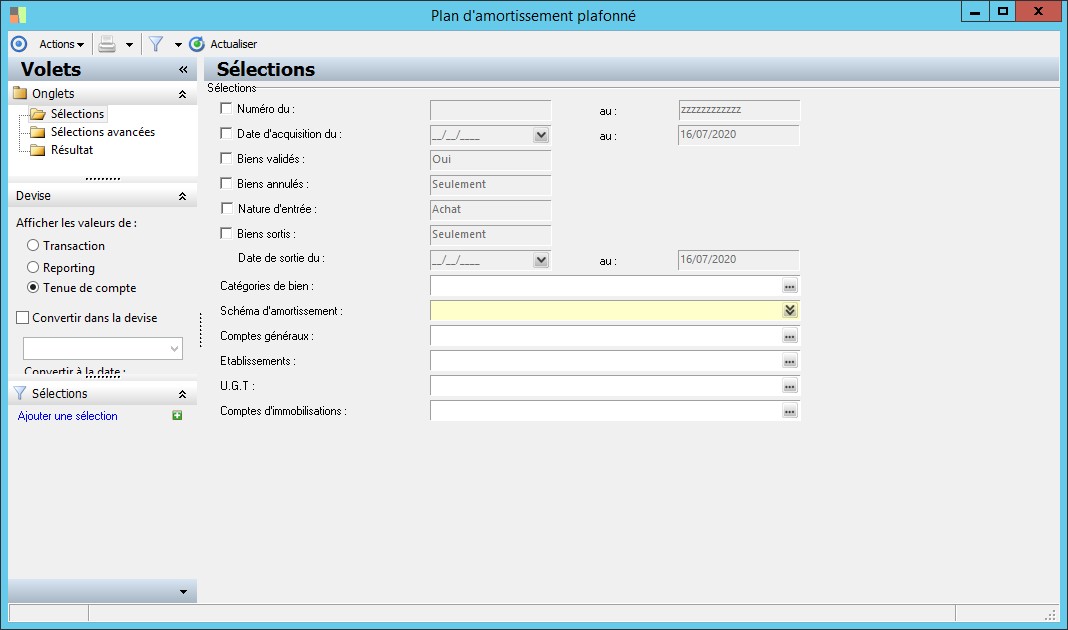 (Sage FRP 1000 Suite Financière) Menu Immobilisations > Restitutions > Plans d'amortissement > Plan d'amortissement plafonné