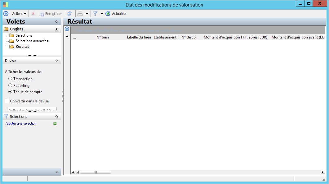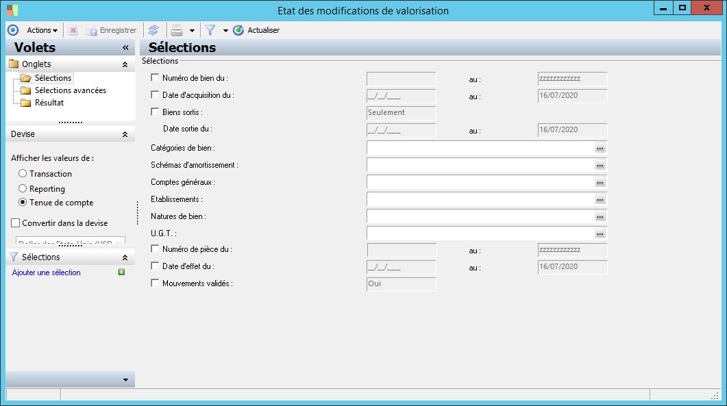 (Sage FRP 1000 Suite Financière) Menu Immobilisations > Restitutions > Biens > Etat des modifications de valorisation