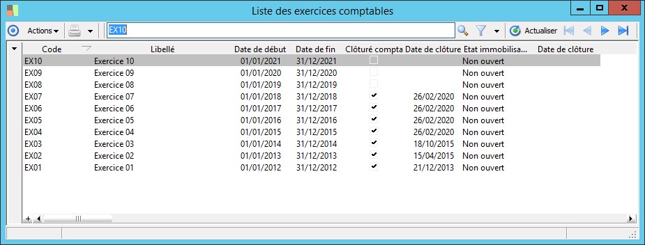 (Sage FRP 1000 Suite Financière) Menu Immobilisations > Paramètres > Comptabilité générale > Liste des exercices comptables