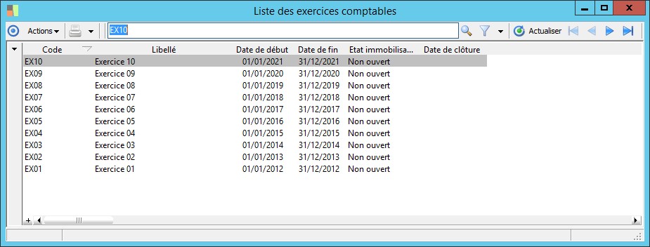 (Sage FRP 1000 Suite Financière) Menu Immobilisations > Paramètres > Comptabilité générale > Liste des exercices comptables