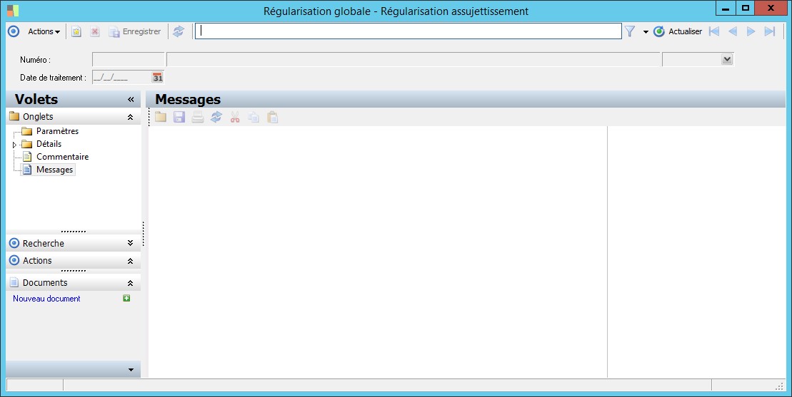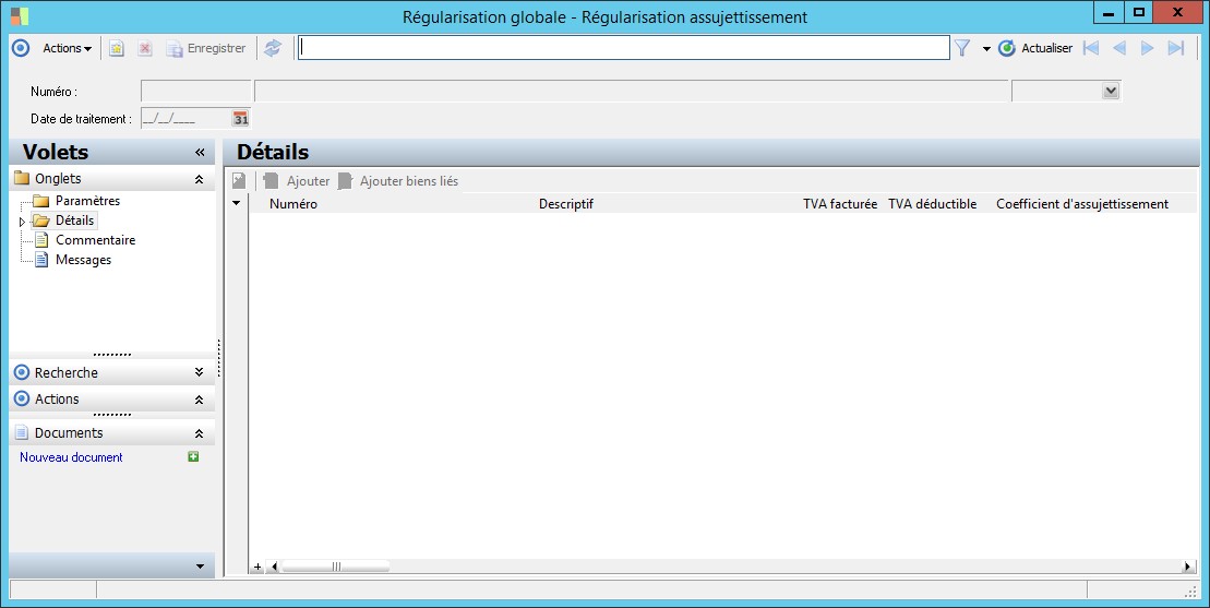 (Sage FRP 1000 Suite Financière) Menu Immobilisations > Suivi comptable > T.V.A. > Régularisation globale - Régularisation assujettissement