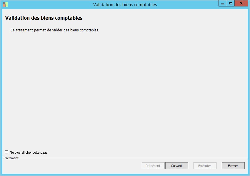(Sage FRP 1000 Suite Financière) Menu Immobilisations > Suivi comptable > Validation > Validation des biens comptables