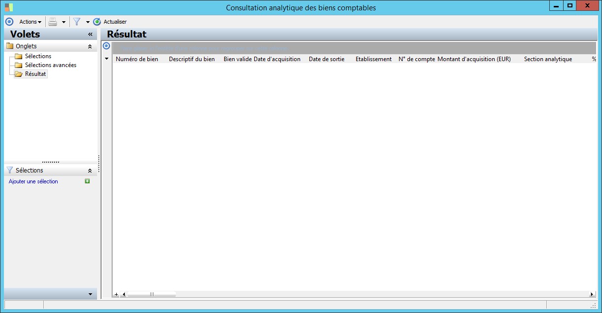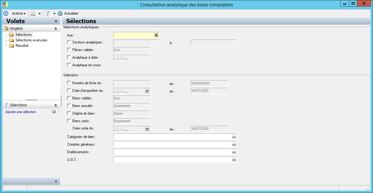 (Sage FRP 1000 Suite Financière) Menu Immobilisations > Restitutions > Biens > Consultation analytique des biens comptables