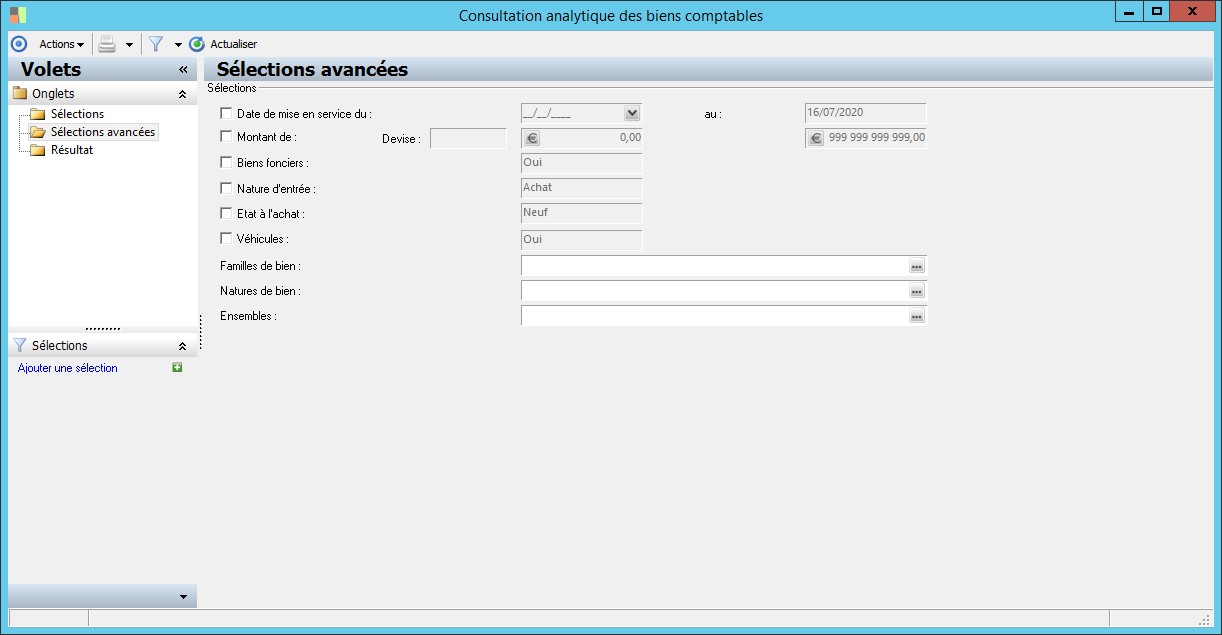 Ce paramètre vous permet de limiter la sélection des biens afin d'afficher :- uniquement les biens avec pièces analytiques validées- ou uniquement les biens avec pièces analytiques non validées. |