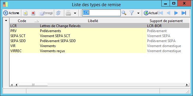 (Sage FRP 1000 Suite Financière) Menu Banque Paiement > Paramètres > Remises > Liste des types de remise