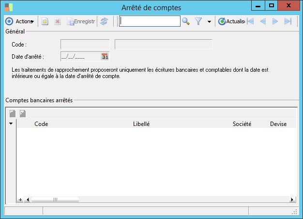 (Sage FRP 1000 Suite Financière) Menu Comptabilité > Générale > Rapprochement > Arrêté de comptes