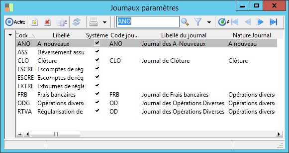(Sage FRP 1000 Suite Financière) Menu Comptabilité > Paramètres > Comptabilité générale > Journaux paramètres
