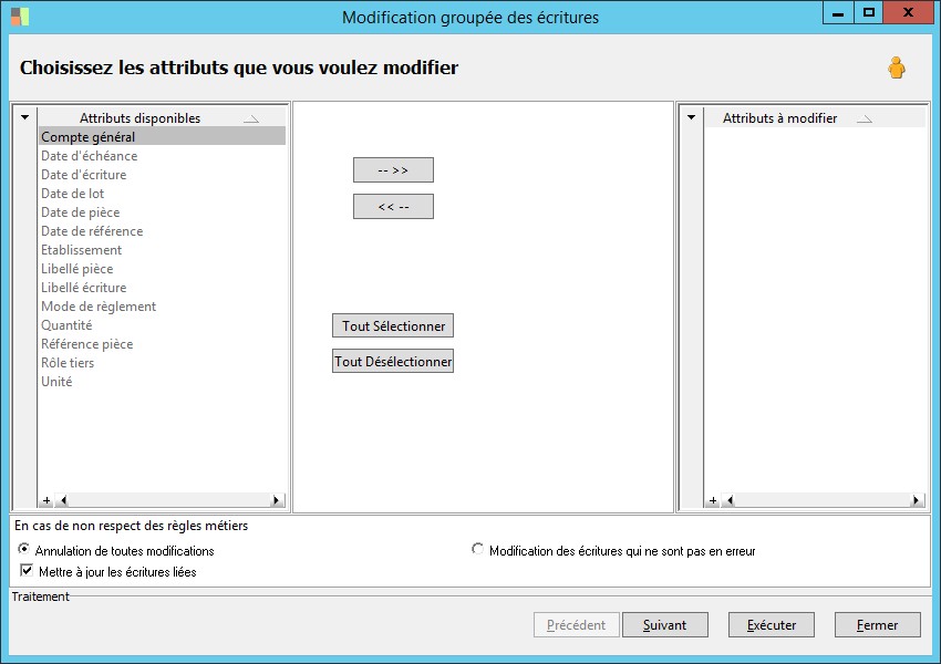 Attributs disponibles : il s'agit des attributs qui peuvent être modifiés par le traitement de modification groupée des écritures.Attributs à modifier : il s'agit des attrributs qui ont été sélectionnés pour être modifiés. |