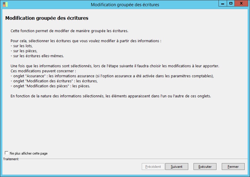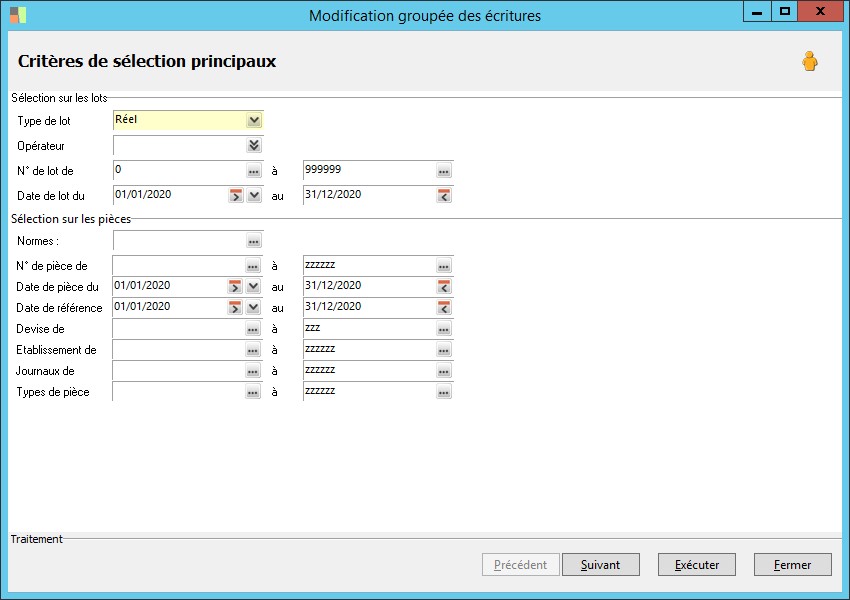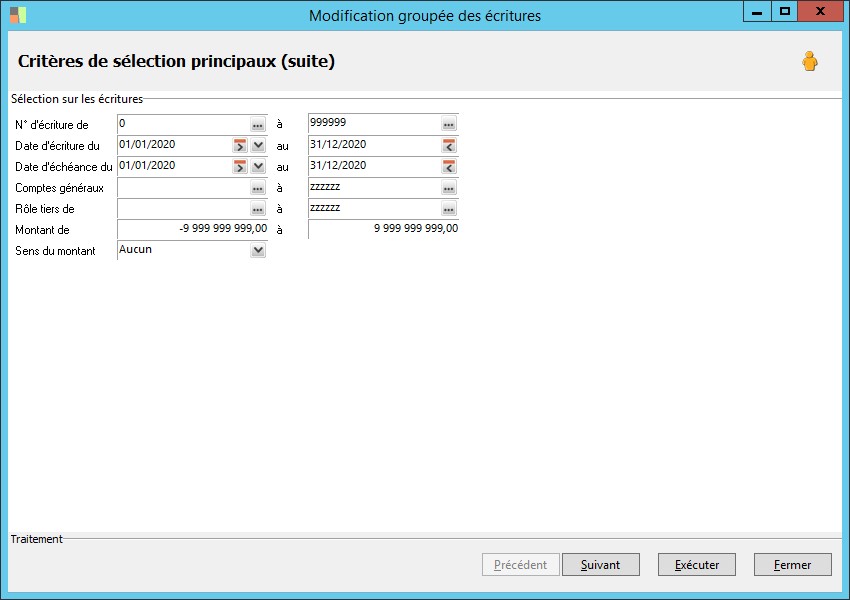 (Sage FRP 1000 Suite Financière) Menu Comptabilité > Générale > Modification groupée des écritures