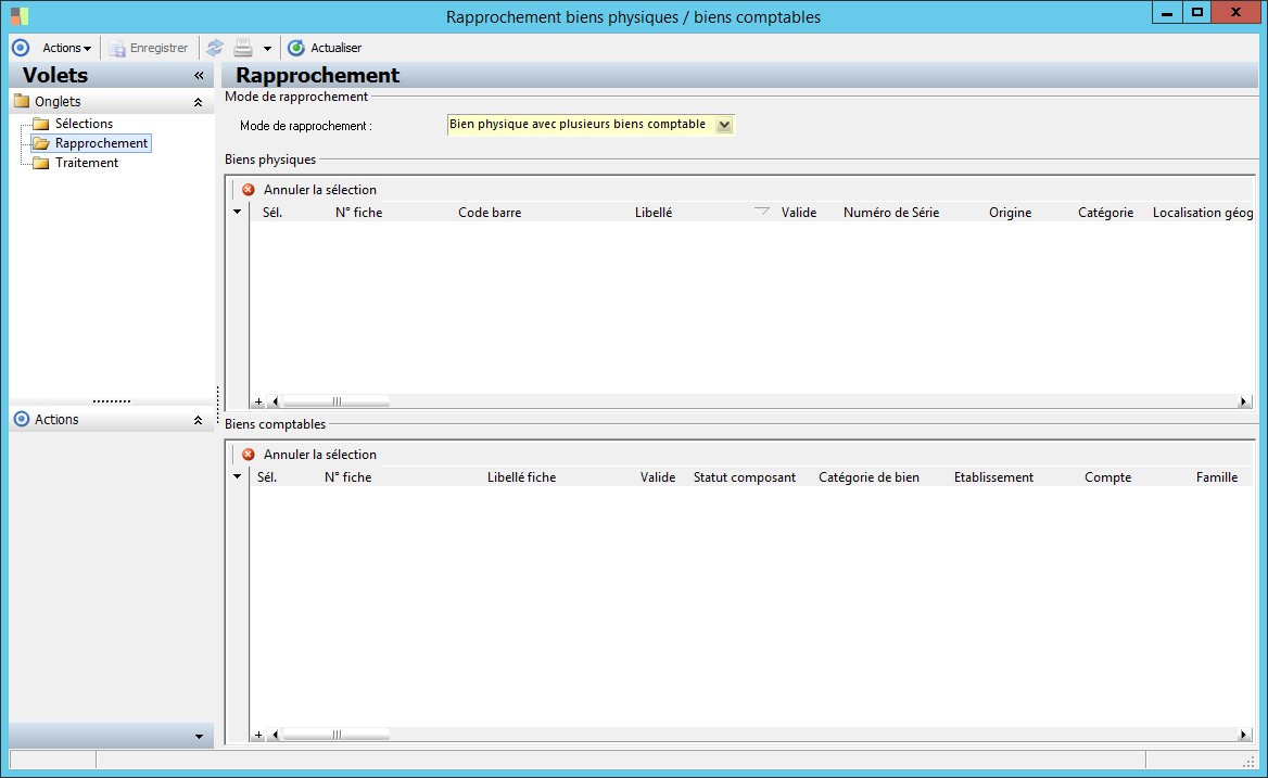 Vous pouvez selectionner ici le type de rapprochement que vous alleez effectuer : - 1 bien physique avec plusieurs biens comptables, - 1 bien comptable avec plusieurs biens physiques. |