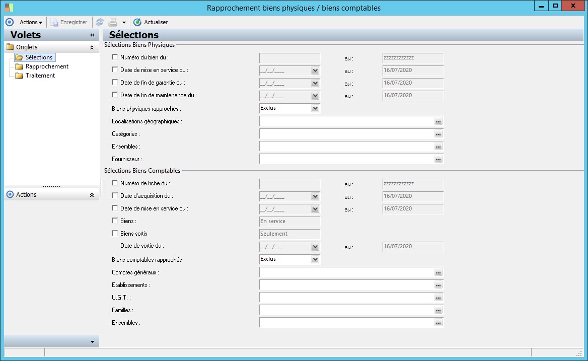 Ce critère permet, selon la valeur sélectionnée :d'exclure les biens physiques rapprochés à des biens comptables.d'inclure les biens physiques rapprochés à des biens comptables.d'avoir seulement les biens physiques rapprochés à des biens comptables. |
